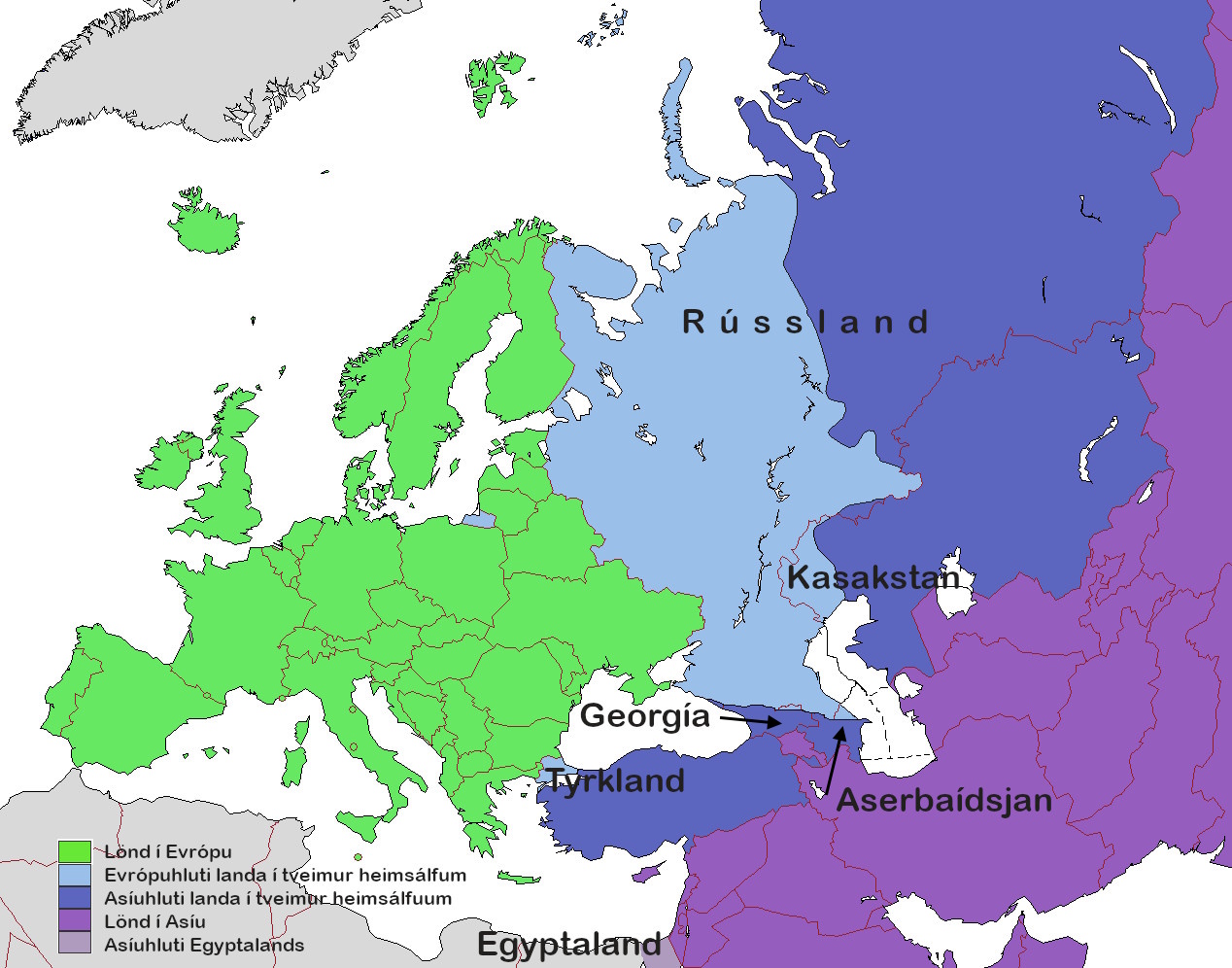 Í eftirfarandi svari er miðað við mörk heimsálfanna eins og þeim í lýst í svari við spurningunni Hvernig eru nöfn heimsálfanna til komin? Til þess að svara þessari spurningu þarf fyrst að ákveða hvort eingöngu er átt við þau ríki sem mörk heimsálfanna liggja í gegnum eða hvort einnig er átt við þau ríki sem „eiga“ eyjar eða landsvæði í annarri heimsálfu en þau tilheyra sjálf. Ef miðað er við hið fyrrnefnda þá eru nokkru ríki sem fjalla í þann flokk, flest sem teljast landfræðilega bæði til Evrópu og Asíu en eitt telst bæði til Afríku og Asíu. Fyrst má nefna Rússland en „línan“ sem skilur að Evrópu og Asíu liggur í gegnum það þannig að sá hluti landsins sem er vestan Úralfjalla er Evrópumegin línunnar en austurhlutinn er í Asíu. Í þennan flokk falla einnig Georgía, Aserbaídsjan og Kasakstan en þau liggja öll að litlum hluta innan Evrópu og tilheyra því í raun tveimur heimsálfum. Það sama gildir um Tyrkland þar sem mörk Evrópu og Asíu liggja um Bospórussund þannig að sá litli hluti landsins sem er norðan sundsins tilheyrir Evrópu en megin hlutinn tilheyrir Asíu. Egyptaland er hins vegar bæði í Afríku og Asíu en mörkin á milli þessar tveggja heimsálfa eru venjulega talin liggja um Súezskurðinn. Það veldur því að norð-austasti hluti landsins, Sínaískaginn, tilheyrir Asíu landfræðilega þó svo Egyptaland í heild teljist til Afríku.![]() |