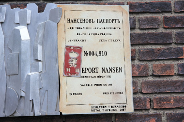 Hið svokallaða Nansen-vegabréf var tilraun Þjóðabandalagsins til að stemma stigu við flóttamannavandanum á þriðja áratug 20. aldar. Myndin sýnir Nansen-vegabréf á vegg í ráðhúsinu í Osló í Noregi en Friðþjófur Nansen, sem vegabréfið er kennt við, var norskur. |
